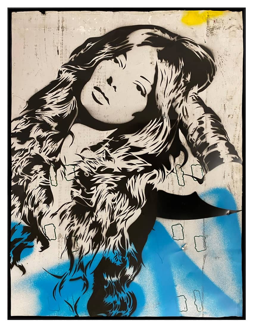 His life-size stencil works feature perfectly styled female models, such as Valeria, whom he models after fashion campaigns. For the background, however, he relies on materials with history, such as decayed or weathered woods and fabrics. Thus, he creates a contrast with the glamor of the fashion world. In many of his works he also uses logos of fashion brands such as Hermes and Chanel, which he alienates. In some cases, this can be understood as homage, such as with brands that look back on a long tradition. In others, it is rather a criticism of the over-industrialization of fashion and invites the viewer to question it.